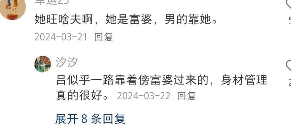 他们的感情曾经屡屡被人唱衰,有网友直言,吕良伟纯粹就是傍富婆吃软饭,是最令人讨厌的演员之一,只想不劳而获。