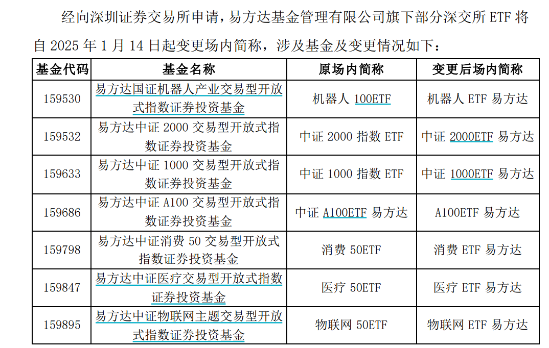 此次变更后,易方达基金旗下ETF简称基本统一按照“标的指数+ETF+管理人名称”或“标的指数+ETF”的规则进行命名。