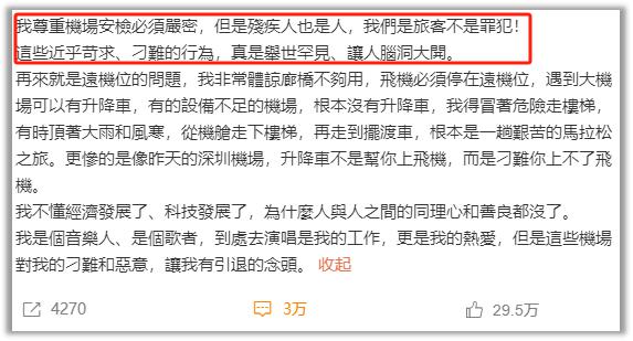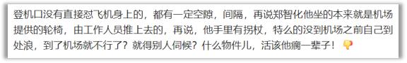 大概就是前几天郑智化发了条微博,说深圳机场对残障人士不友好。升降车离飞机门有 25 厘米的落差,他轮椅进不了飞机,升降车也没升上去,导致他"连滚带爬"进了飞机。