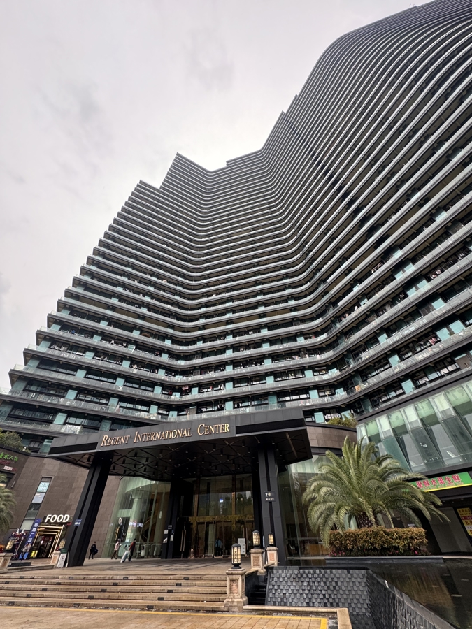 出钱江世纪城地铁站再步行三五分钟,一眼就能看到这幢外立面呈“S”形的独特大楼。抬头望去,墨绿色的玻璃外立面层叠高耸,入口处跳动的喷泉水花和“REGENT INTERNATIONAL CENTER”的英文名彰显着这里昔日的华光。