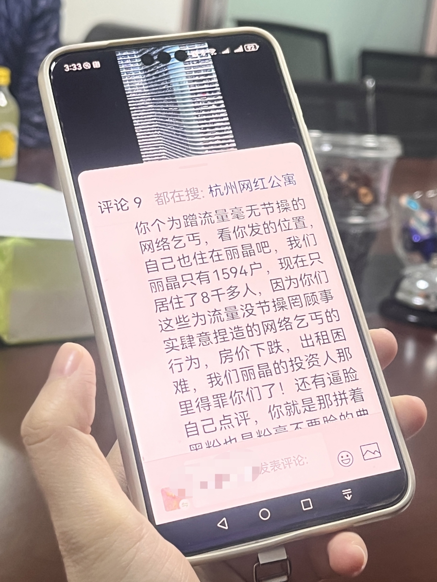 业主在“污名化”丽晶国际的视频下留言反击。 陈欣怡 摄