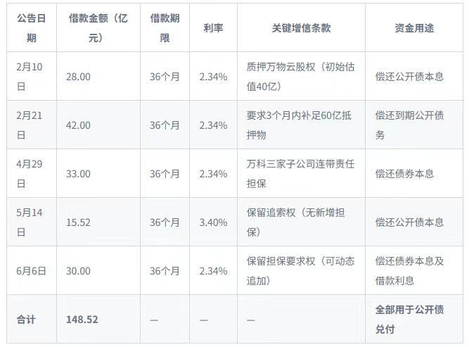 先是在2月份提供了两笔28亿元和42亿元的借款,要求万科按照70%的质押率提供增信资产;而后在4月和5月又相继给万科借款了33亿元和15.52亿元,并且万科无须提供任何增信资产;6月6日,深铁再提供30亿元的股东借款给万科,利率与前四次一样,同为2.34%,且借款利息无须分期支付,只需在债务到期时结清即可。